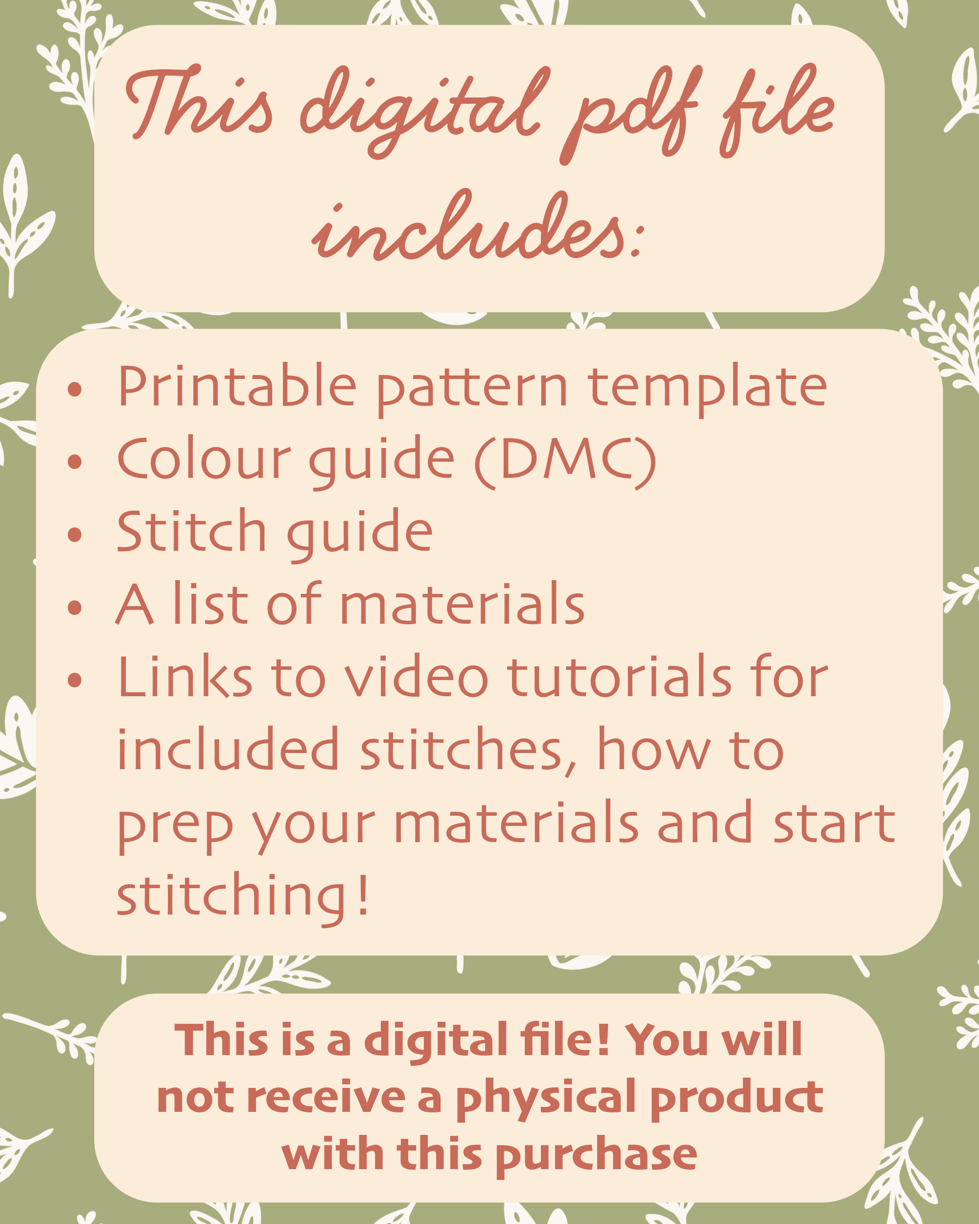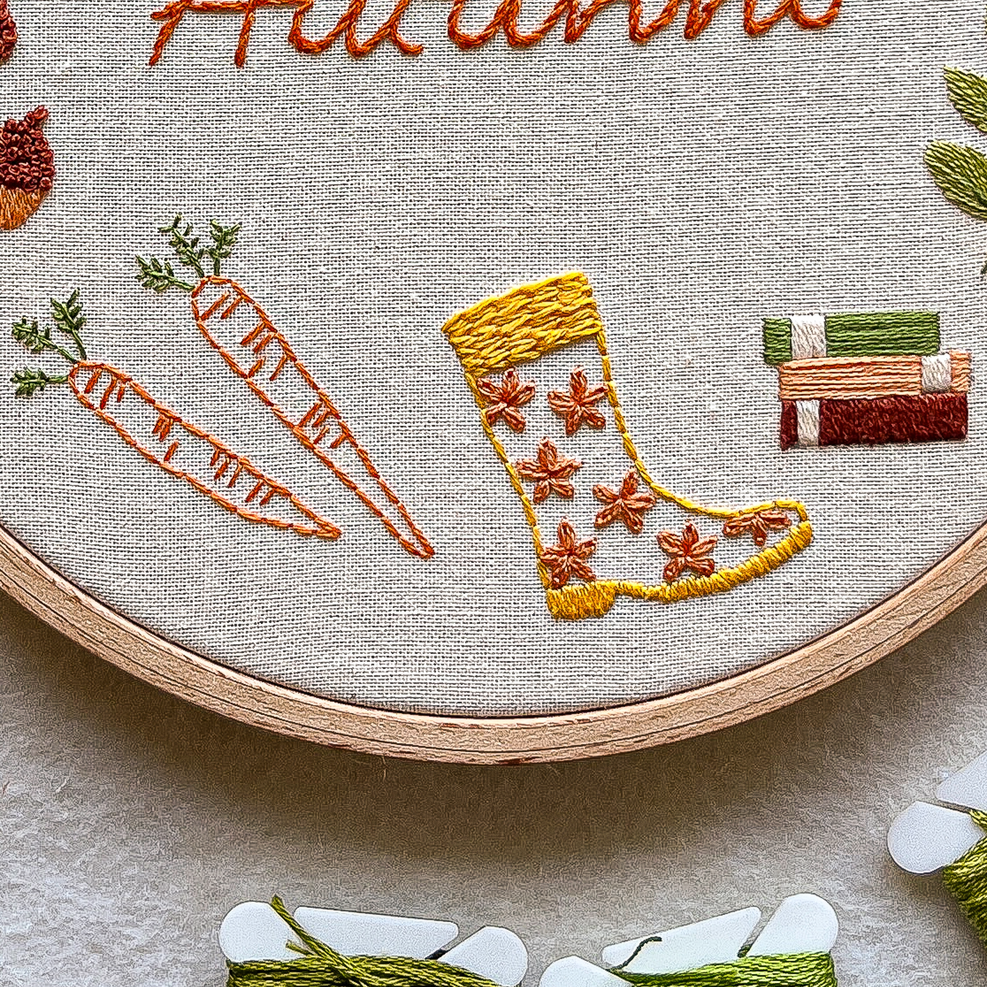 Porta un po’ di atmosfera autunnale nella tua casa con questo pattern di ricamo digitale per principianti, perfetto per un telaio da 15 cm / 6 inch. Questo progetto delicato e accogliente raffigura zucche, foglie colorate, carote, libri e stivali da pioggia, tutti pronti per essere ricamati! Ideale per creare decorazioni stagionali o regali fatti a mano unici.