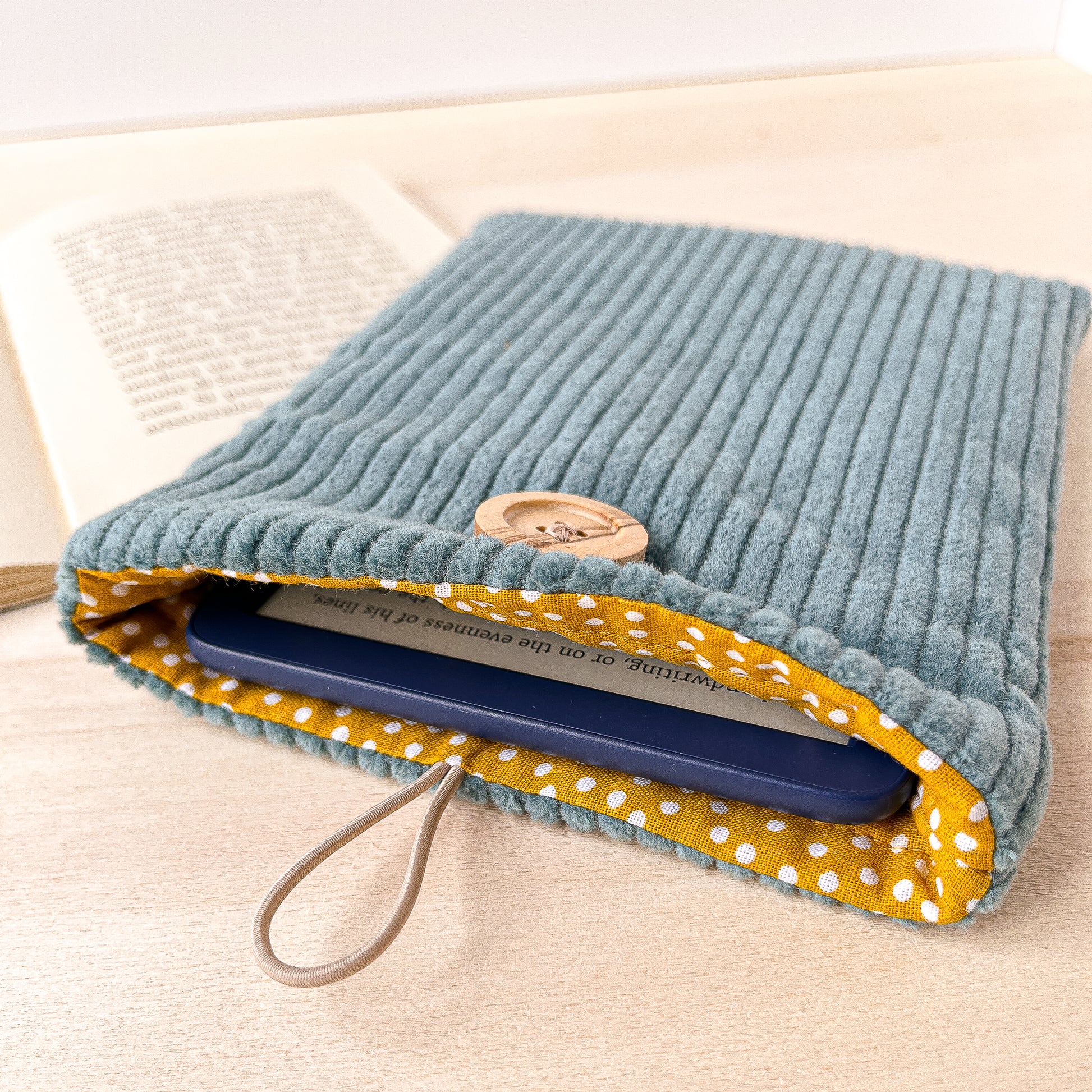 Custodia per e-reader in velluto azzurro con fodera gialla