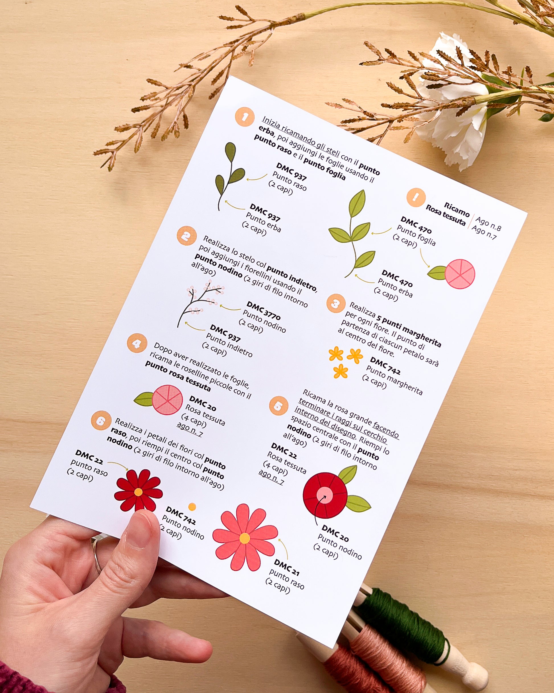 Insieme al manuale riceverai anche i disegni dello schema punti e dello schema floreale che vedi nelle foto e la scheda colori e punti di istruzioni per creare il tuo primo ricamo.