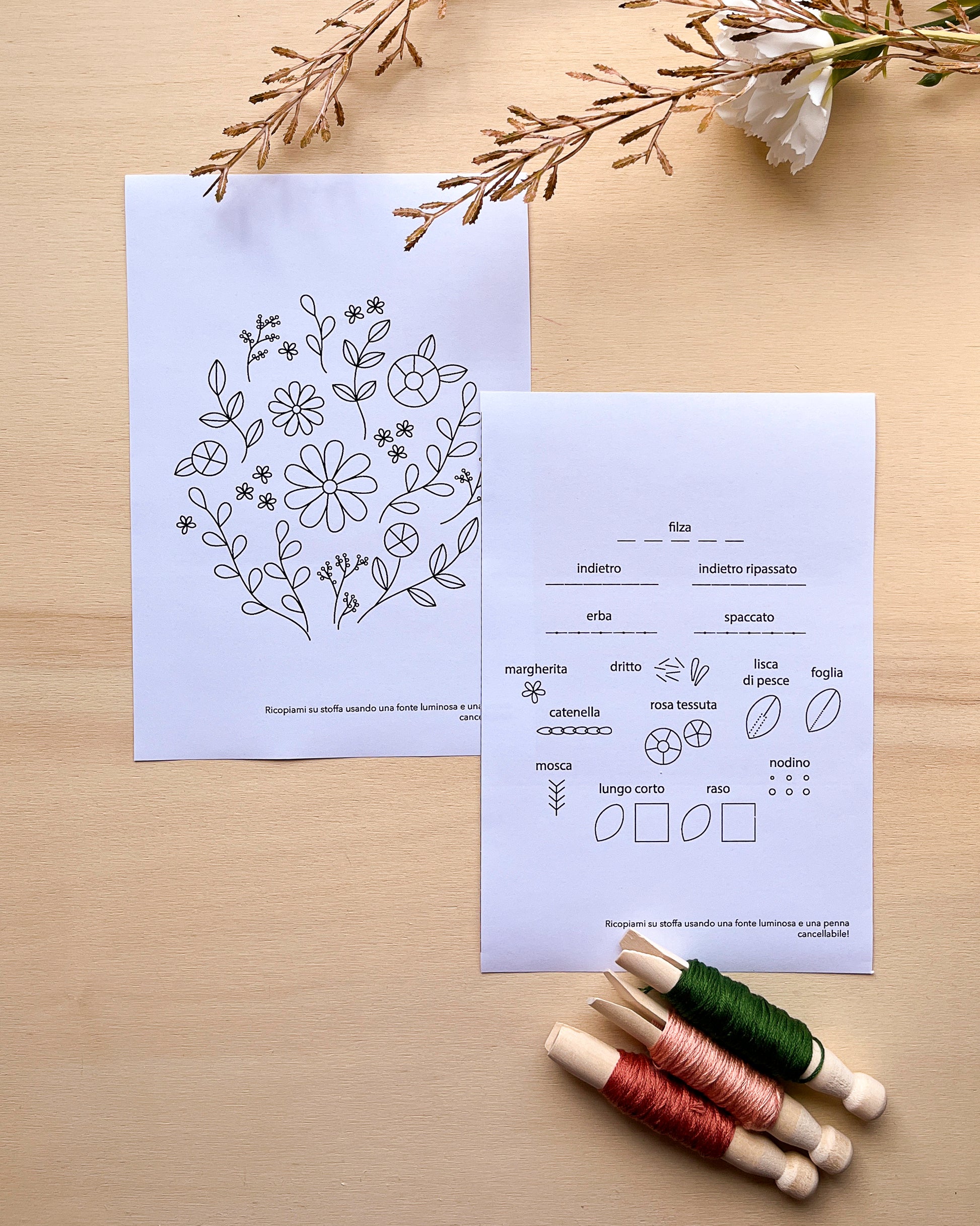 - 2 schemi in bianco e nero stampati per ricopiare su stoffa i punti base e la composizione floreale