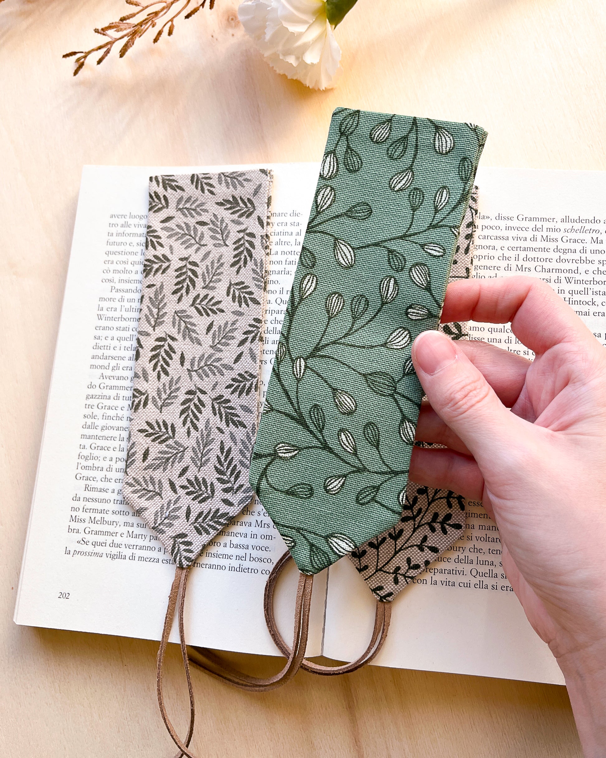 Set di 3 segnalibri in stoffa realizzati a mano con cotone certificato e bellissime fantasie botaniche. Leggeri, resistenti e ideali per accompagnare ogni lettura, aggiungono un tocco naturale e delicato alle tue pagine.