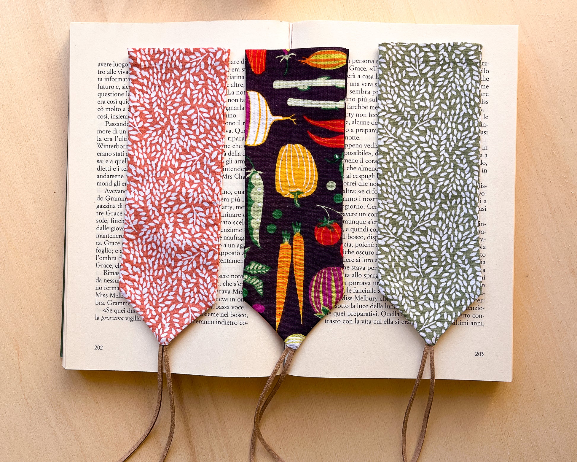Set di 3 segnalibri in stoffa realizzati a mano con cotone certificato e bellissimi pattern colorati. Leggeri, resistenti e ideali per accompagnare ogni lettura, aggiungono un tocco allegro e colorato alle tue pagine.